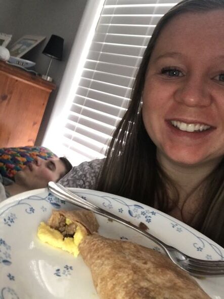 This is me having a breakfast burrito shortly before leaving for the hospital. I had been in active labor all morning. My husband was awake with me in the middle of the night so I let him sleep a little before we left.